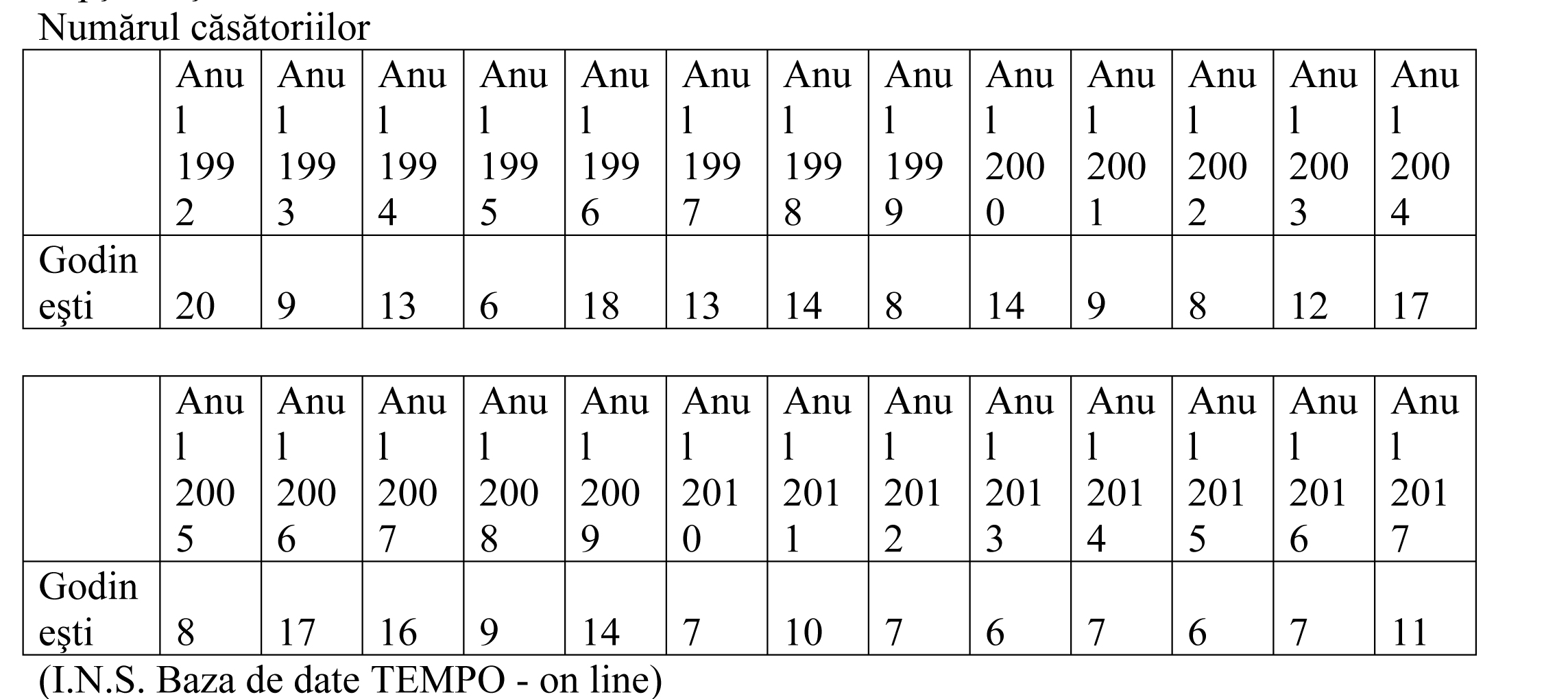 Dacă se analizează numărul căsătoriilor din ultimii 25 de ani, se constată că de la 20 de căsătorii în 1992 a scăzut numărul acestora la numai 8 în 2002 şi la 10 în 2011, ajungându-se la 11 căsătorii în anul 2017, spre deosebire de anul 2015, când sunt consemnate 6 căsătorii şi anul 2016, când s-au înregistrat 7 căsătorii, deci, o rată a nupţialităţii foarte scăzută.