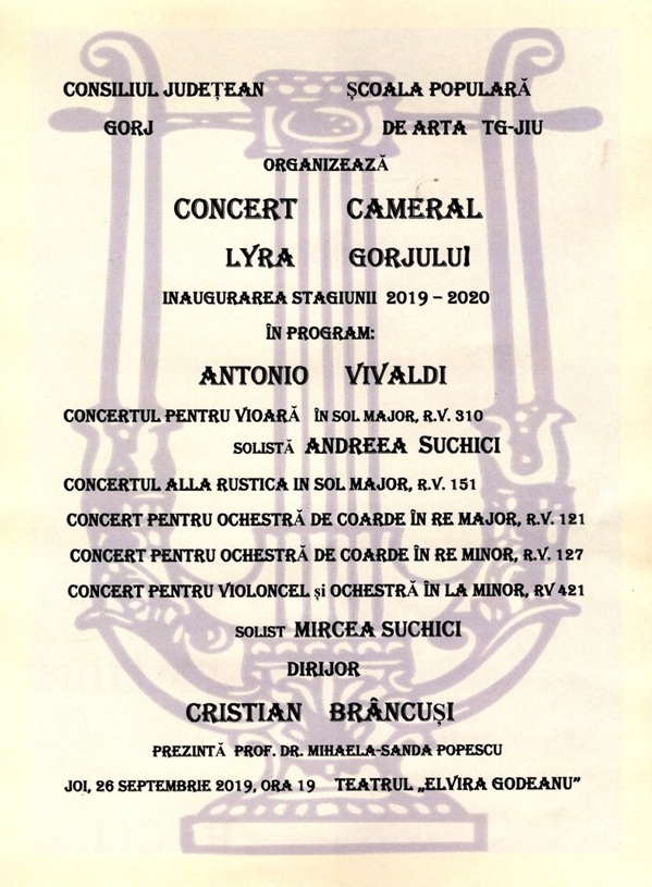 Joi, 26 septembrie, ora 19.00, la Teatrul Elvira Godeanu, începe stagiunea de concerte – Lyra Gorjului. În program, Antonio Vivaldi – compozitorul care dă strălucire concertului în epoca Barocului. Soliști: tânara și talentata violonistă, Andreea Suchici și binecunoscutul violoncelist, Mircea Suchici. Dirijor, invitatul de onoare, maestrul Cristian Brâncuși, compozitor și pedagog, originar din Târgu-Jiu, prezență autentică pentru care gestul dirijoral este muzica însăși. Prezentarea programului, prof. dr. Mihaela – Sanda Popescu
