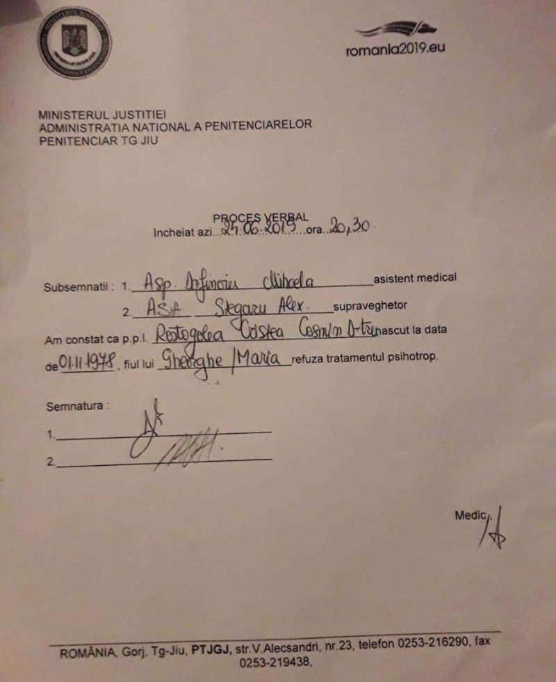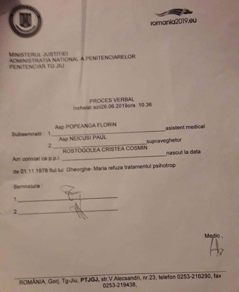 În ziua în care deținutul Cosmin Cristea Rostogolea s-a spânzurat în celula în care se afla singur, după prezența în fața instanței de judecată, acesta a fost vizitat de trei comisii medicale din Penitenciarul Târgu-Jiu. Cel puțin asta a aflat familia îndoliată la o lună după decesul bărbatului de 40 de ani. Comisiile l-au vizitat pe 26 iunie 2019 pe deținut la orele 6.30, apoi la 10.36 și la 11.45. Toți voiau să-i administreze lui Rostogolea un tratament psihotrop. Comisiile au mai trecut pe la deținut aflat în refuz de hrană și cu o zi în urmă, seara, la ora 20.00, dar și pe 24 iunie când acesta a fost adus de la Penitenciarul-spital Mioveni, la ora 20.30. De fiecare dată, deținutul a refuzat tratamentul care i-ar fi afectat mintea, după ce a cerut prospectul medicamentului pe care aceste comisii voiau să i-l administreze.