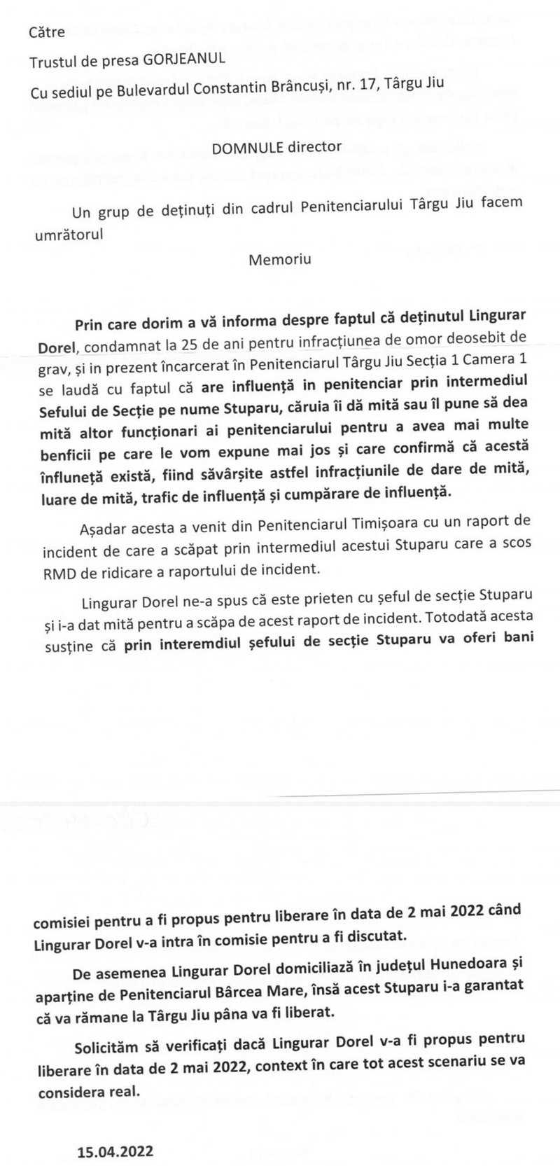 Din motive încă neștiute, o persoană lipsită de libertate sau mai multe, se adresează Gorjeanul prin intermediul unei scrisori numite ,,memoriu”, în care solicită sprijin pentru demascarea acestui condamnat.