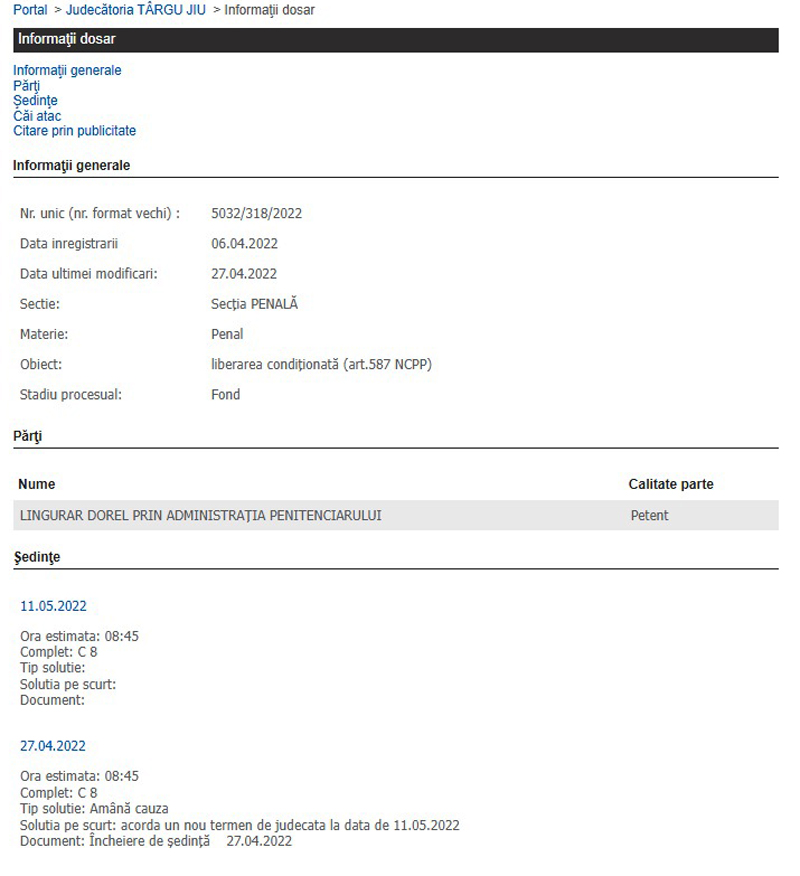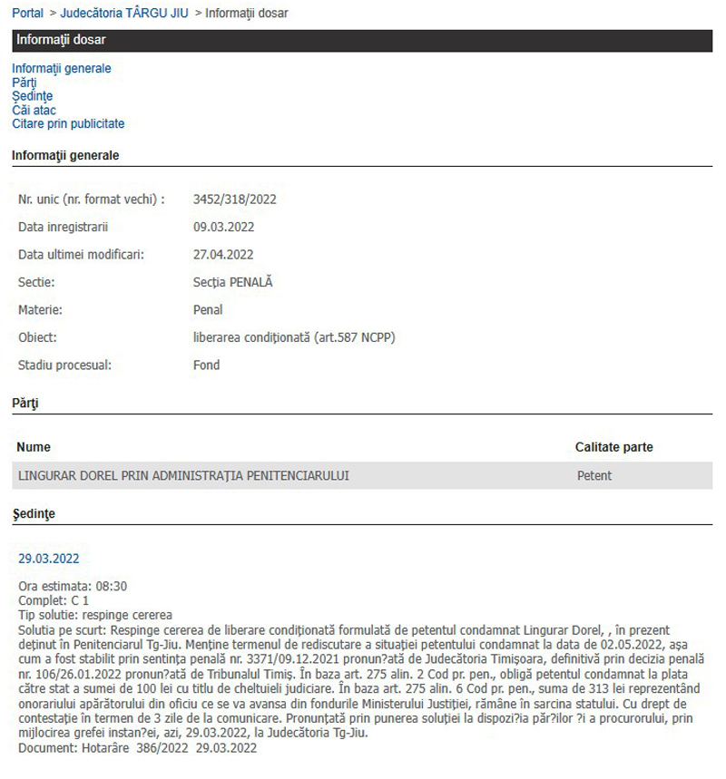 Ajuns probabil în noiembrie la Penitenciarul Târgu-Jiu, deținutul Dorel Lingurar adresează instanței din municipiu mai multe cereri de eliberare condiționată, toate respinse pe fond. Deținutul insistă însă, chiar dacă este obligat la cheltuieli de judecată de câteva sute de lei și așteaptă acum, ca luna viitoare, pe 11 mai, să ajungă iar în fața judecătorului pentru o eventuală eliberare condiționată.