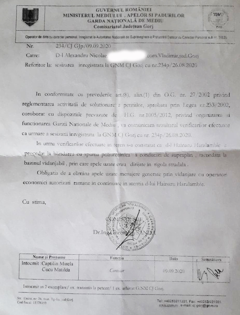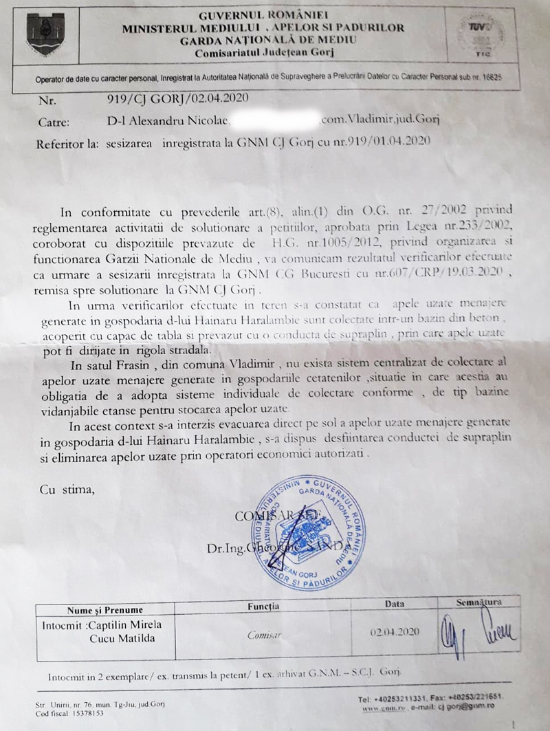 În aprilie 2020, comisarii Gărzii de Mediu Gorj ajung la locuința din Vladimir, la cetățeanul acuzat că își poluează olfactiv vecinii. Comisarii constată că apele uzate generate din