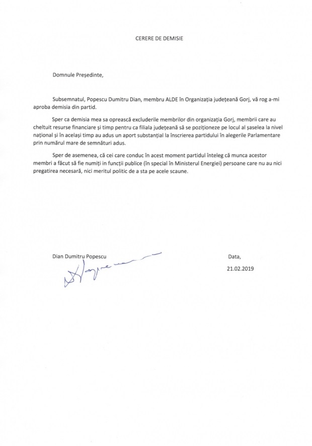 Fostul președinte al ALDE Gorj, Dian Popescu, a demisionat din partid. În scrisoarea de demisie, înaintată conducerii centrale a partidului, Popescu explică motivele gestului său: excluderile din ALDE Gorj și promovarea de oameni incompetenți în funcții, în special la Ministerul Energiei. „Nu mă interesează demisia lui Dian Popescu. Este o gargară”, ne-a declarat președintele ALDE Gorj, Ion Iordache.