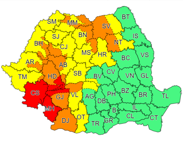 În județele Mehedinți, Caraș-Severin și zona de mute a județelor Gorj și Hunedoara, vor fi averse torențiale și abundente.