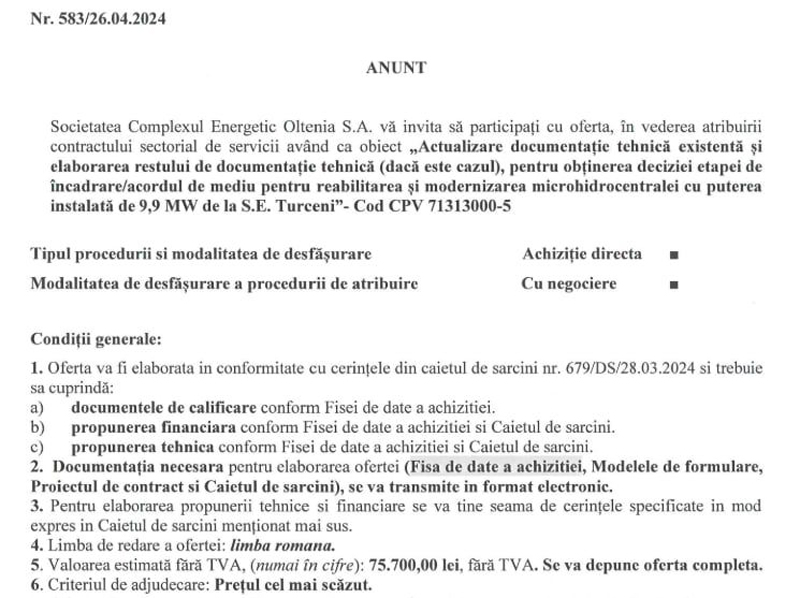În zilele noastre, mai precis, în data de 26 aprilie, șefii CEO și-au amintit de microhidrocentrala de la Turceni și, astfel, aflăm că nici documentația nu este finalizată pentru a primi avizele necesare în vederea începerii lucrărilor de modernizare… ,,Actualizare documentație tehnică existentă și elaborarea restului de documentație tehnică (dacă este cazul), pentru obținerea deciziei etapei de încadrare/acordul de mediu pentru reabilitarea și modernizarea microhidrocentralei cu puterea instalată de 9,9 MW de la S.E. Turceni”.