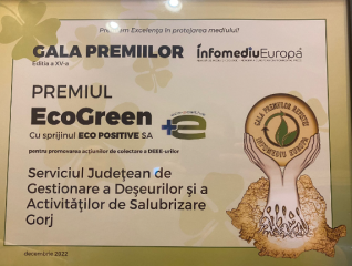 În cadrul Galei Premiilor InfomediuEuorpa, ediția a XV-a, Direcția de Management Integrat a Deșeurilor și Protecția Animalelor Gorj, din cadrul Consiliului Județean Gorj, a fost premiată pentru modul în care a organizat și desfășurat campania pentru colectare a deșeurilor vechi (DEEE-uri), a anunțat Luis Popa, directorul Direcției.