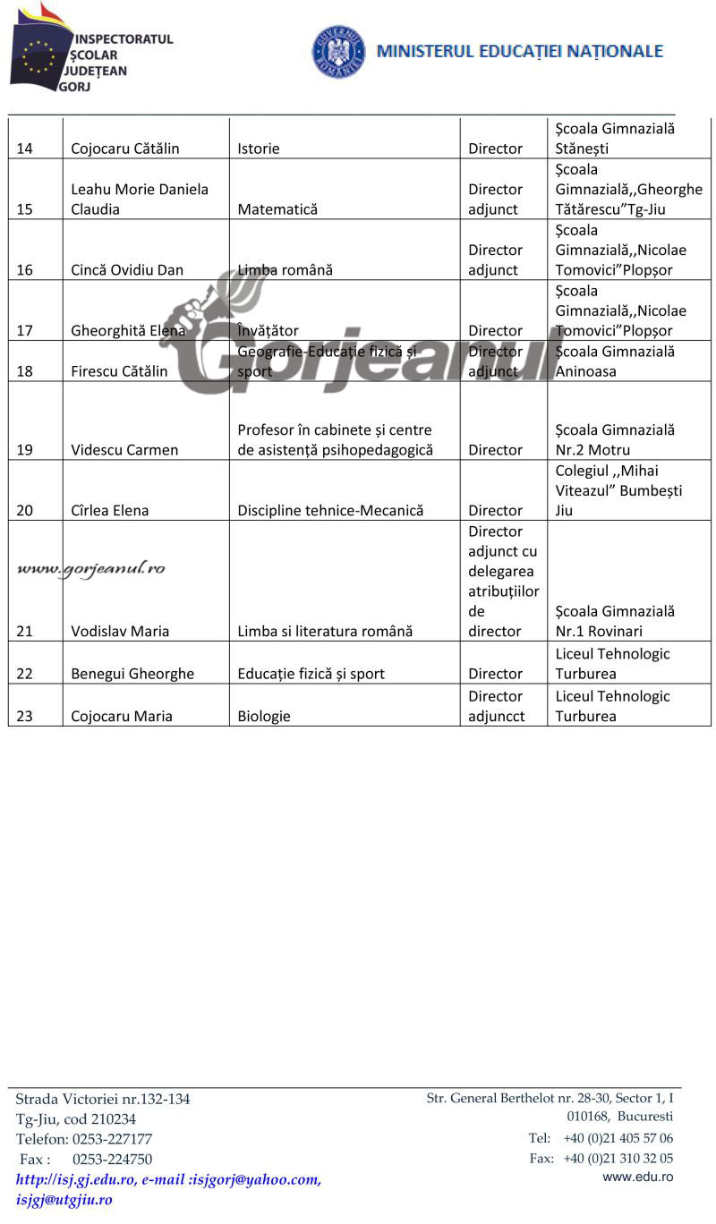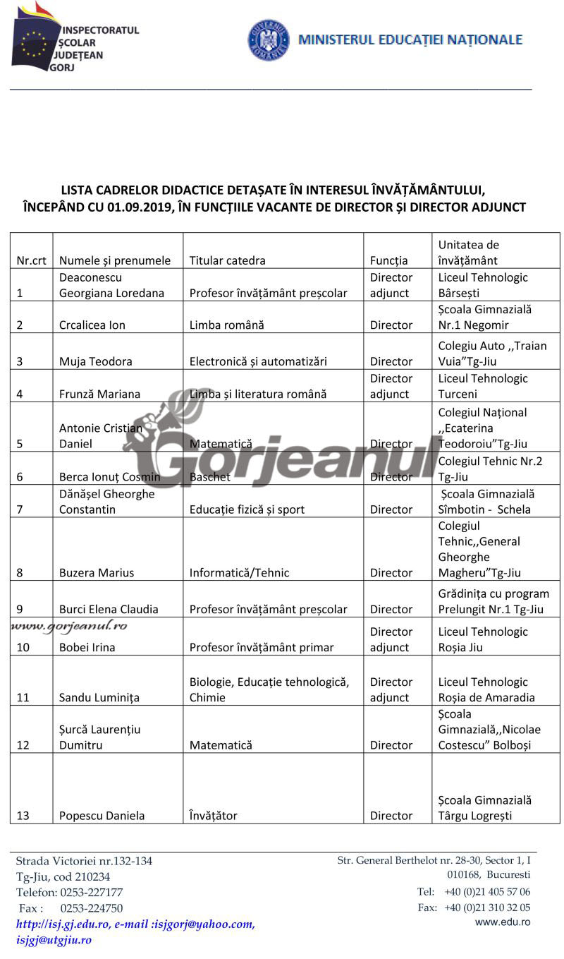 Directorii adjuncți numiţi în funcţie sunt: Georgiana Loredana Deaconescu (Liceul Tehnologic Bârseşti), Mariana Frunză (Liceul Tehnologic Turceni), Irina Bobei (Liceul Tehnologic Roşia Jiu), Luminiţa Sandu (Liceul Tehnologic Roşia de Amaradia) şi Cătălin Firescu (Şcoala Gimnazială Aninoasa).