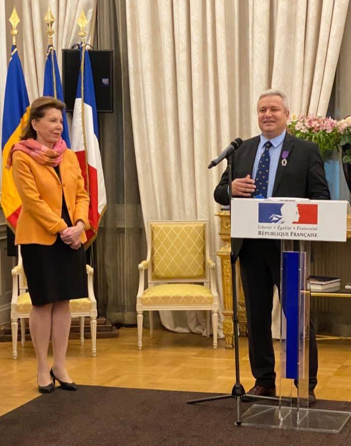 „Am avut onoarea ca alături de familie și alături de prieteni dragi, cărora le mulțumesc pentru că mi-au fost aproape, să primesc din partea Excelenței Sale, doamna ambasador Michele Ramis, distincția Les Palmes Academiques în grad de cavaler. Sunt bucuros de această realizare care, așa cum am spus și în discursul de la ambasadă, nu este recompensa unui efort individual, ci a unui efort colectiv și le mulțumesc pe această cale tuturor celor de la care am învățat și învăț zilnic”, a spus prorectorul Mădălin Bunoiu.