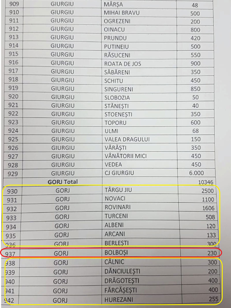 Primăria Hurezani a luat și ea la rectificare 255.000 de lei, aceasta având din septembrie edil liberal. Primăria Dănciulești cu edil PNL, tot din septembrie, a primit la rectificarea de joi 200.000 de lei. Primul pesedist din listă, care a luat bani la rectificare, a fost edilul de Bolboși care a obținut 230.000 de lei, acesta fiind acuzat de trădare. Organizația edilului de Bolboși a fost dizolvată, miercuri, de conducerea PSD.Primăria Logrești, cu primar PNL, a luat 75.000 de lei la rectificare, în timp ce Primăria Licurici tot cu un liberal în frunte a obținut 50.000 de lei la rectificarea de ieri. Primăria Roșia de Amaradia cu edil PNL a obținut 400.000 de lei la rectificare, iar Samarinești 177.000 de lei. Primăria Săcelu a obținut 300.000 de lei la rectificare cu edil liberal, dar și Schela a luat 70.000 de lei tot cu nou primar liberal. Primăria Țânțăreni cu edil PNL a obținut 357 de lei la rectificare, în timp ce UAT Turcinești a luat 394.000 de lei.Primăria Stoina cu edil PMP a luat 81.000 de lei la rectificare, în timp ce a doua primărie PSD prinsă în schemă a fost Slivilești. Comuna lui Bucurescu a obținut 300.000 de lei la rectificarea bugetară, edilul fiind acuzat că a fraternizat cu PNL la alegerile parlamentare, motiv pentru care organizația sa social democrată a fost decapitată, miercuri.