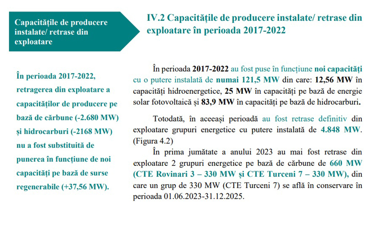 ,,Deși realizarea unor noi obiective de investiții (noi investiții în capacități pe gaze naturale și surse regenerabile de energie) a fost prevăzută încă din anul 2020, iar până la finalul anului 2022 a fost înregistrat un grad de realizare de 0%, în iulie 2023 au fost semnate contractele de finanțare între Ministerul Energiei și societăți mixte create pentru realizarea de noi capacități de producție energie electrică din surse solare (cele 8 parcuri fotovoltaice) cu o capacitate totală instalată de 735 MW și a unui singur grup pe gaze naturale de la Turceni cu o capacitate de 475 MW”, conform raportului de audit.