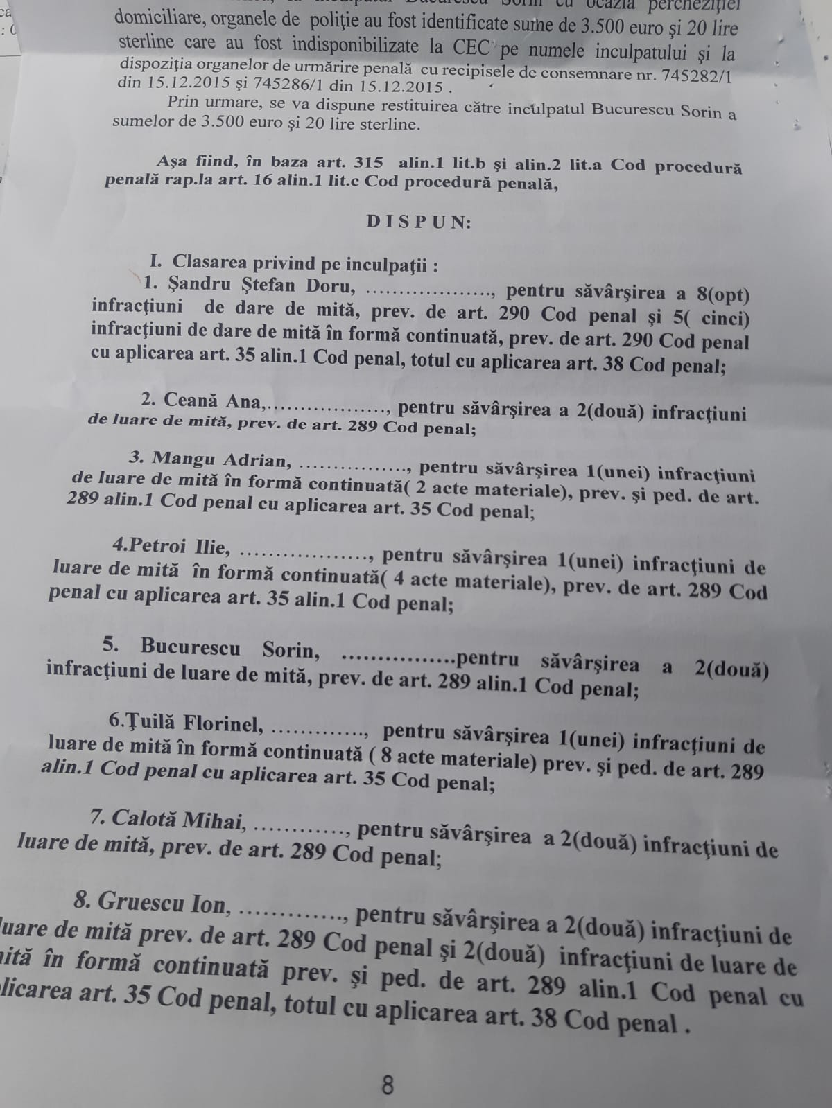 Mai precis, în acest dosar au fost anchetaţi pentru fapte de corupţie primarul Mihai Calotă din Urdari, Adrian Mangu, edilul comunei Bărbătești, Ilie Petroi, primarul din Aninoasa, dar și Sorin Bucurescu, edilul comunei Slivilești, precum și primarii Petre Grigorie de la Plopșoru, Florinel Țuilă din Cătunele, Ion Gruescu de la Negomir și Ana Ceană, primarul comunei doljene Melinești.