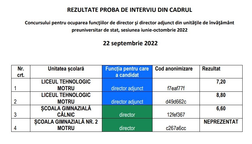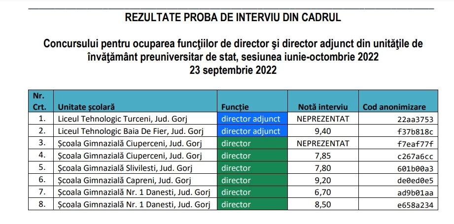 Inspectoratul Școlar Județean Gorj a publicat rezultatele înregistrate în urma desfășurării probei de interviu, din 22 și 23 septembrie, din cadrul celei de-a treia sesiuni a concursului pentru ocuparea funcțiilor vacante de director și director adjunct din unitățile de învățământ. Doi candidați au obținut note sub 7, pragul minim de promovare, iar alți doi au reușit să ia note peste 9. Trei dascăli nu s-au prezentat însă în fața comisiei de concurs.