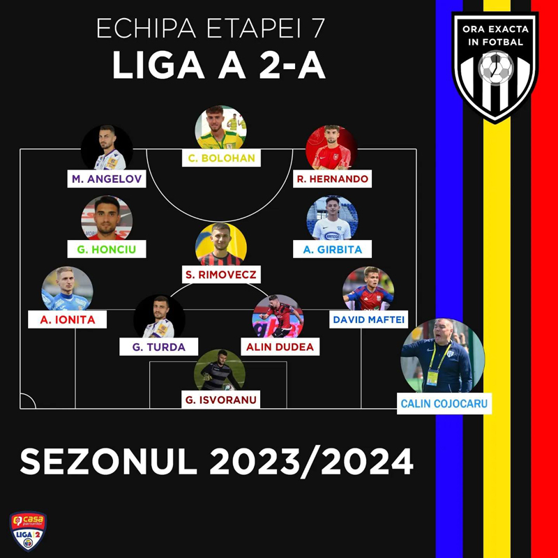 Viitorul Târgu Jiu a dat doi oameni în echipa etapei, potrivit ,,Ora exactă în fotbal”. Mijlocașul Alex Gîrbiță a ajuns la 5 goluri în acest sezon și conduce clasamentul celor mai buni marcatori din liga secundă. După al doilea succes consecutiv, 2-1 cu Corvinul Hunedoara, antrenorul Călin Cojocaru a fost ,,desemnat” în fruntea celui mai bun 11 din runda a 7-a. Interesant este că timișoreanul a declarat că ,,golgheterul” echipei gorjene nu este încă la potențialul său maxim. ,,Nu eu l-am reinventat pe Gîrbiță. El muncește, trebuie să muncească mai mult, să devină mai puternic și, cu siguranță, poate mult mai mult de ce arată astăzi”, a spus Cojocaru după ultimul succes. În runda următoare, Viitorul joacă pe terenul Reșiței.