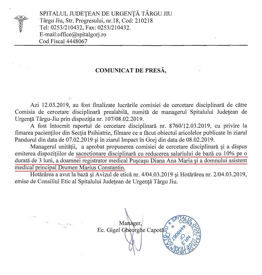 Un registrator medical și un asistent medical din cadrul Spitalului Județean de Urgență Târgu-Jiu au fost găsiți vinovați pentru imaginile filmate și distribuite pe facebook cu pacienți internați în Secția de Psihiatrie ai SJU, respectivii fiind surprinși în ipostaze erotice. Ambii angajați au fost sancționați la salariu, pentru trei luni.