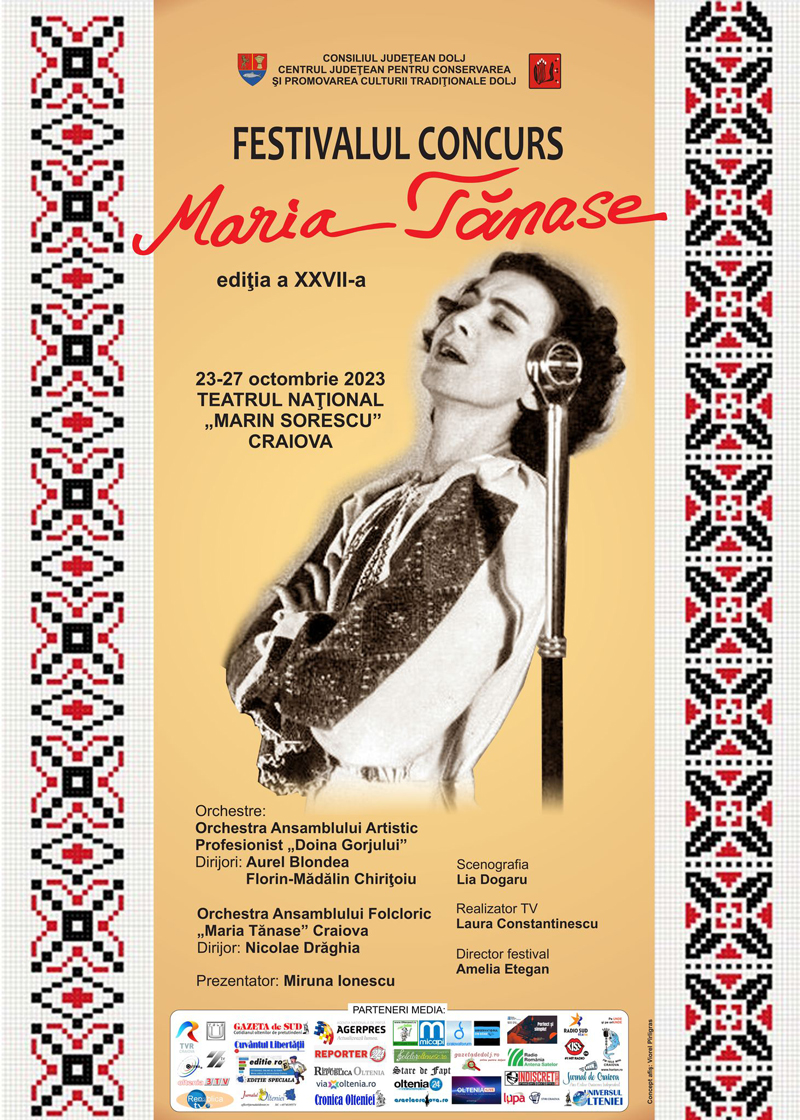 Festivalul – Concurs Național al Interpreților Cântecului Popular Românesc „Maria Tănase” – ediția XXVII-a a început ieri, la Craiova, urmând a se derula până pe data de 27 octombrie. În serile festivalului, pe scena Teatrului Național ”Marin Sorescu” Craiova, vor urca și membrii Ansamblului Folcloric ”Doina Gorjului”.