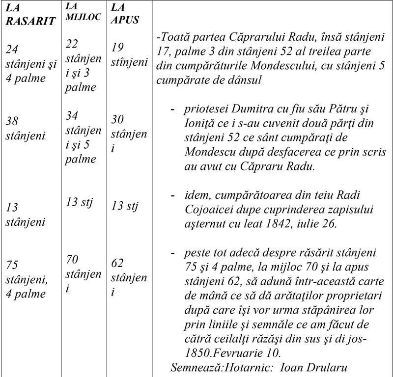Deosăbit mai cumpără Radu Căpraru stânjeni 5 dela Ioan şi Ilie din teiu ungureni cu zapis 1842 iulie 17 şi stânjeni 13 care vinde Rada Cojoaca cu fiu său Ghiţă popii lui Dumitru ot Stoina cu zapis 1842 iulie 26, în care să cuprinde că arătaţii stânjeni îi vinde masă şi încheie toate cumpărătorile precum să arată, ale cărora părţi să arată în tabla de mai jos cât să cuvine pă al fiecăruia obrazu la toate trăpurile: