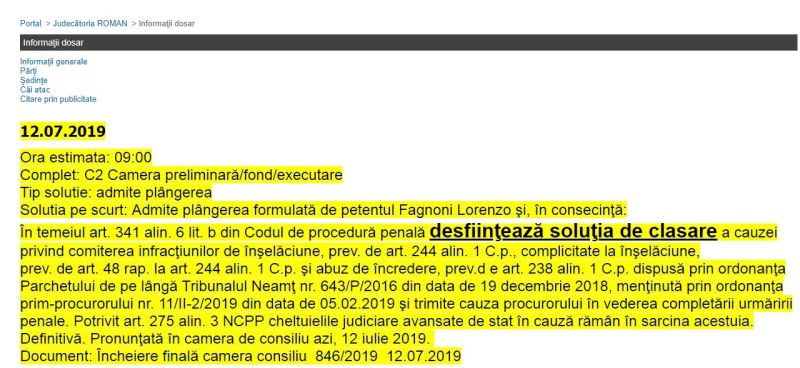 De fapt, Lorenzo Fagnoni a atacat la Judecătoria Roman ordonanţa Parchetului de pe lângă Tribunalul Neamţ nr. 643/P/2016 din data de 19 decembrie 2018, menţinută prin ordonanţa prim-procurorului nr. 11/II-2/2019 din data de 05 februarie 2019. Practic, prin dovezile depuse la dosarul cauzei, Lorenzo Fagnoni a demonstrat că anchetatorii nu au făcut cele necesare în acest dosar penal, procurorii urmând să acorde acum mai multă atenție acuzațiilor italianului. Subliniem că spre deosebire de ancheta demarată de procurorii Parchetului de pe lângă Tribunalul Gorj, în dosarul Francesco vs. Simona, procurorii de la Piatra Neamț nu au pus sechestru pe averea celor două Ștefănescu.