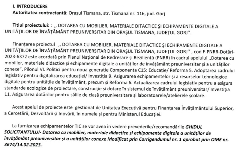 „Autoritatea contractantă intenţionează să achiziţioneze echipamente TIC pentru laborator informatică, sală de clasă, laborator integrat de științe, cabinetul școlar, cabinetul psihopedagogic în cadrul Proiectului «Dotarea cu mobilier, materiale didactice și echipamente digitale a unităților de învățământ preuniversitar din Orasul Tismana, județul Gorj – Componenta Echipamente TIC», finanțat prin Planul Național de Redresare și Reziliență. În cadrul activității ce urmează a fi achiziționată se urmărește furnizarea de produse și instalarea acestora”, potrivit caietului de sarcini. Ofertele sau cererile de participare se depun până pe data de 19 decembrie.