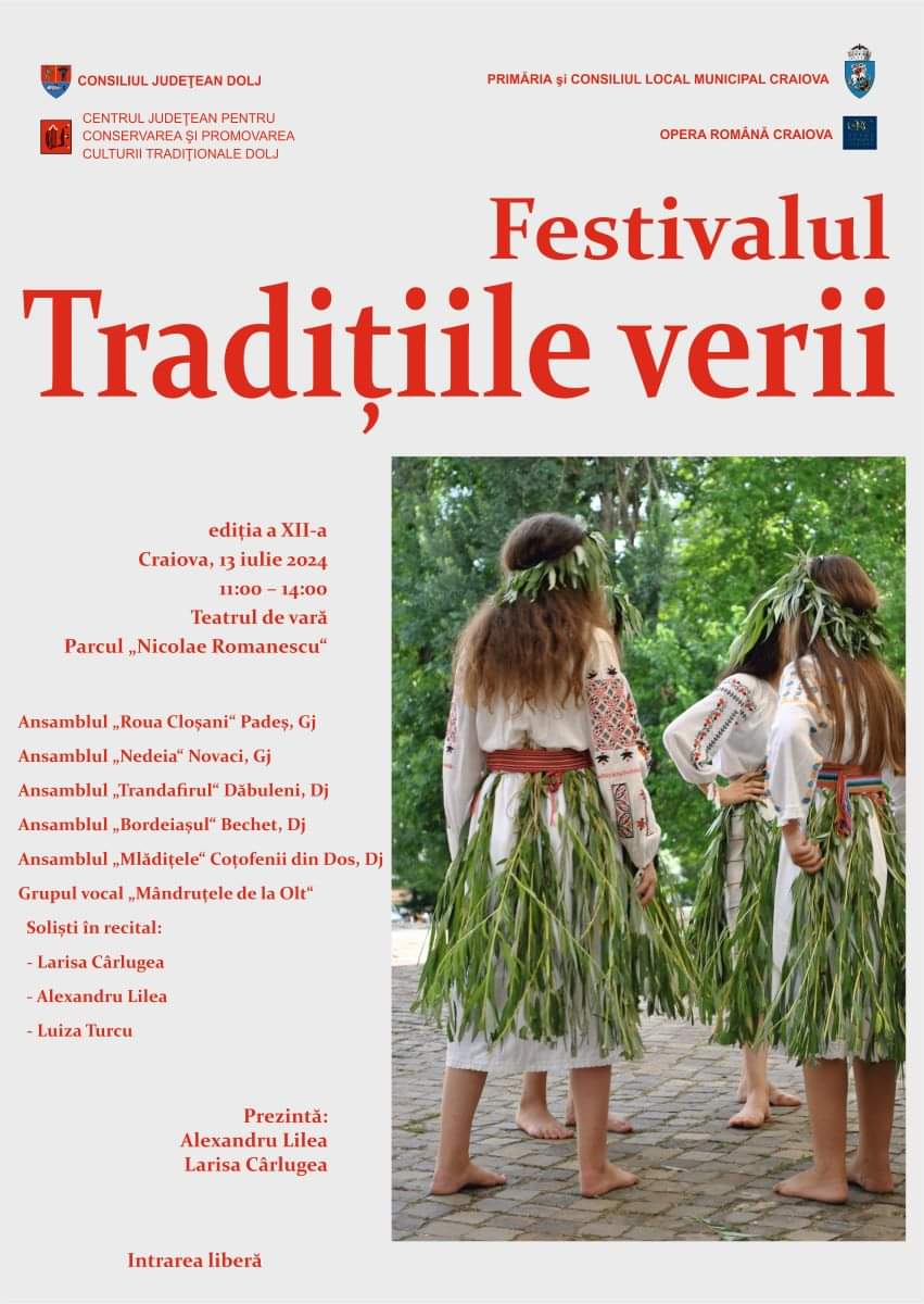 „Ansambluri și soliști din judeţele Dolj și Gorj ne bucură cu obiceiuri și tradiții întâmplate vara în lumea satului, cum sunt: Sânzienele sau Drăgaica, Paparudele, Duminica la horă-n sat după secerat, cositul și secerișul, toate dăruite iubitorilor de folclor ca într-o zi de mare sărbătoare, din care nu lipsesc dansurile și cântecele populare. Participă la această ediție a Festivalului de datini și obiceiuri „Tradițiile verii“: Carmen Sarcină și Ansamblul de datini și obiceiuri „Roua Cloșani“ din Padeș – Gorj, Ansamblul folcloric „Nedeia“ al Casei de Cultură din Novaci – Gorj, Grupul vocal „Mândruțele de la Olt“, Ansamblul folcloric „Trandafirul“ al Casei de Cultură din Dăbuleni – Dolj, Ansamblul folcloric „Bordeiașul“ din Bechet – Dolj, Ansamblul folcloric „Mlădițele“ Coțofenii din Dos – Secție Externă a Școlii Populare de Arte și Meserii „Cornetti“ Craiova. De asemenea, ne bucurăm să-i avem în recital pe soliștii Luiza Turcu, Larisa Cârlugea și Alexandru Lilea. Luiza Turcu este laureată a Festivalului Național al Interpreților Cântecului Popular Românesc „Maria Tănase“ – Marele Premiu și Trofeul „Maria Tănase” și Premiul de popularitate – nominalizat de public, la ediția a XXV-a, în 2019, Larisa Cârlugea a obținut Premiul II la ediția din 2023, iar Alexandru Lilea este laureat al acestui festival, cu premiul II în anul 2017. Festivalul de datini şi obiceiuri „Tradiţiile verii“, ediţia a XII-a, se va desfășura sâmbătă, 13 iulie, la Teatrul de vară din Parcul „Nicolae Romanescu“, între orele 11:00 – 14:00 și va fi prezentat de Alexandru Lilea și Larisa Cârlugea. Accesul la eveniment este gratuit și se face în limita locurilor disponibile”, au anunțat organizatorii.