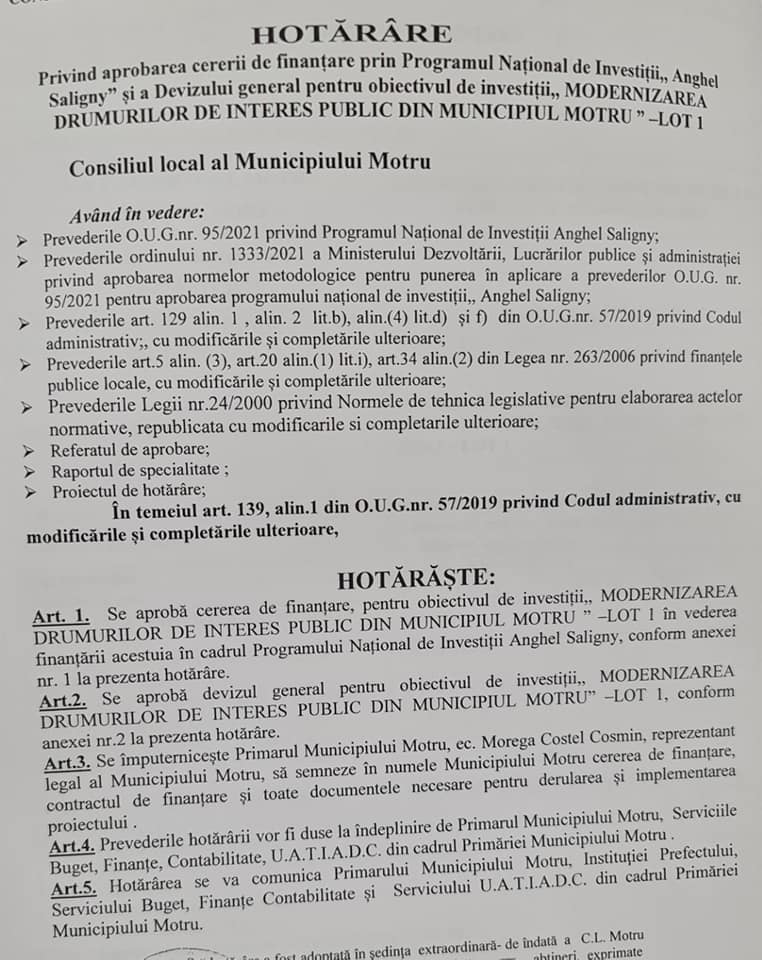 „Vineri am depus două proiecte necesare pentru comunitate pe noul program „Anghel Saligny”. Este vorba de modernizarea drumurilor de interes public din Municipiul Motru (10.414.612,95 lei cu TVA) și extindere canalizare menajeră, branșamente, racorduri la rețeaua de apă și canalizare în Horăști, Leurda și Râpa din Municipiul Motru – 15 .647.972,48 lei cu TVA pentru 15,5 km de rețele noi”, a anunțat primarul Cosmin Morega.