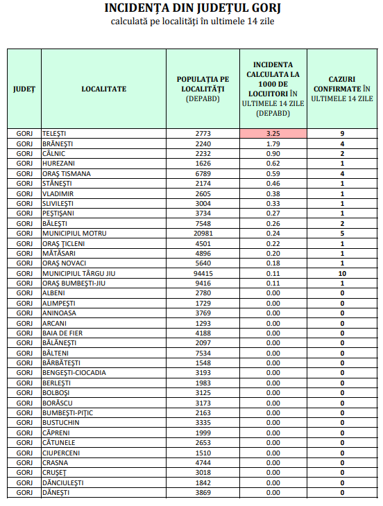 „Având în vedere că incidența cumulată la 14 zile este mai mare de 3/1.000 de locuitori în localitatea Telești (3,60), pentru perioada 31.08.2021, ora 00.00 – 13.09.2021, ora 24.00, se dispun următoarele măsuri:
