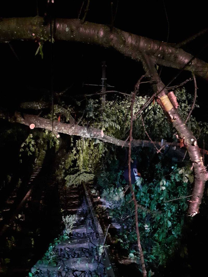 Două trenuri de călători au staționat între stații câteva ore! Circulația între Lainici și Pietrele Albe, oprită temporar după o furtună violentă