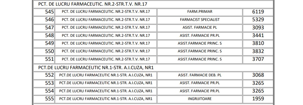 Celălalt post este disponibil la farmacia nr. 1 a spitalului, de pe A.I. Cuza. Și în acest caz interesul a fost unul mare. 21 de candidați vor susține examenul pe post. Taxa de înscriere a fost de 150 de lei. Încă nu a fost stabilită comisia de concurs, spitalul având la dispoziție cel mult trei luni de la data publicării anunțului – 15 aprilie pentru a organiza concursul.