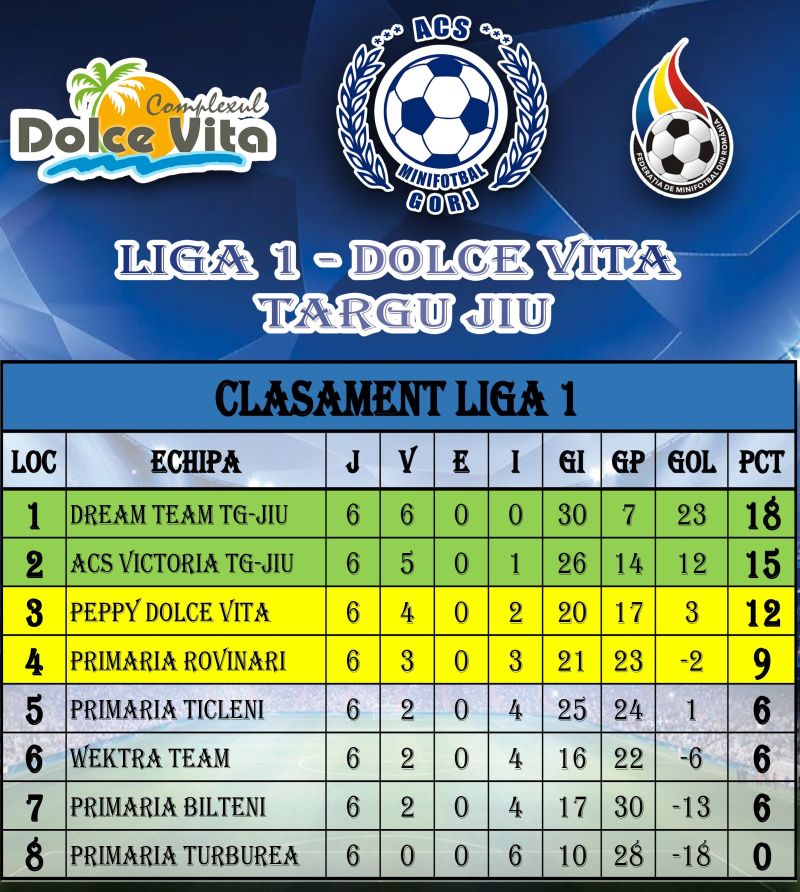 Derby-ul Ligii 1 de minifotbal de la Dolce Vita a fost tranșat de campioana Dream Team Târgu Jiu. Aceasta s-a impus, la fel ca în finala Cupei de săptămâna trecută, cu 2-1 în meciul cu ACS Victoria. Succesul le asigură campionilor un avans de 3 puncte după primele șase etape. Partida s-a jucat, sâmbătă, în Complexul Dolce Vita. Dacă în urmă cu o săptămână, Dream Team a marcat golul victoriei la ultima fază a meciului, acum a condus cu 2-0 până în ultimul minut, atunci când adversarii au înscris golul de onoare.