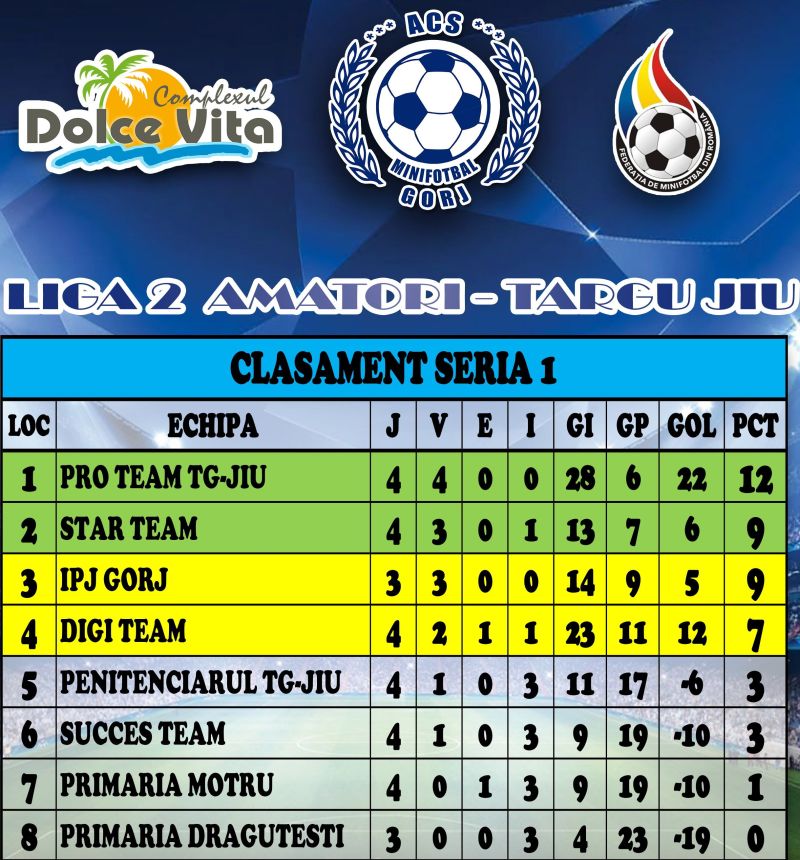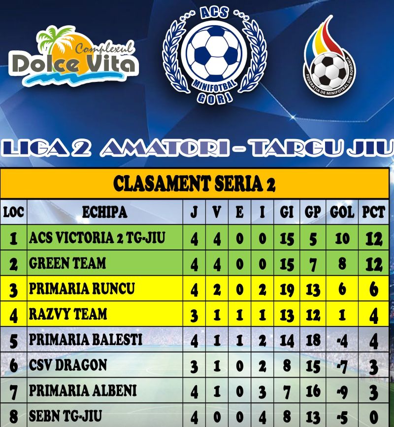 În Liga 2 Amatori, au avut loc jocurile etapei cu numărul 4. Pro Team Târgu Jiu din Seria 1, respectiv ACS Victoria 2 Târgu Jiu și Green Team din Seria 2, sunt echipele cu maxim de puncte după primele 4 runde ale sezonului. În cel mai interesant meci al etapei, ACS Victoria 2 Târgu Jiu a luptat să revină de la 0-2 și 2-3, pentru a se impune cu scorul de 4-3 în fața celor de la Primăria Bălești.