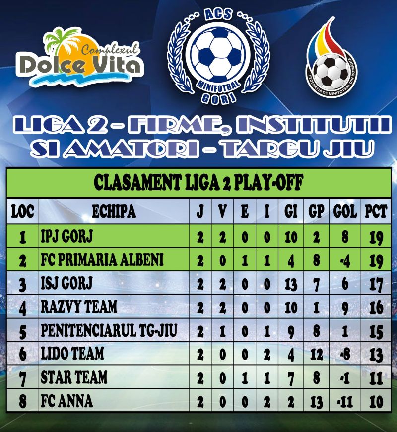 În Liga 2 a avut loc a doua rundă din faza de Play-off. Inspectoratul de Poliție Gorj a trecut pe primul loc, grație golaverajului, după victoria clară cu Penitenciarul Târgu Jiu. FC Primăria Albeni este la egalitate de puncte cu IPJ Gorj, în urma remizei cu Star Team. Albeni a condus cu 3-0, dar cei de la Star au revenit în ultimele 10 minute. Inspectoratul Școlar Gorj s-a revanșat pentru eșecul cu Lido Team din ultima etapă a sezonului regular și s-a impus acum la o diferență confortabilă. Răzvy Team este și ea în urcare în clasament, după cea de-a doua victorie consecutivă în Play-off, cu FC Anna.