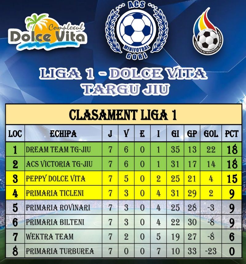 Surpriză la final de tur în Liga 1 de minifotbal de la Dolce Vita. Campioana și liderul la zi, Dream Team, a pierdut meciul cu Primăria Țicleni și încheie turul la egalitate de puncte cu rivala ACS Victoria Târgu-Jiu. Formaţia din Țicleni a reușit surpriza ultimei etape din acest an şi, după un meci spectaculos, a întors rezultatul de la pauză şi a trecut de campioana ultimelor ediţii.