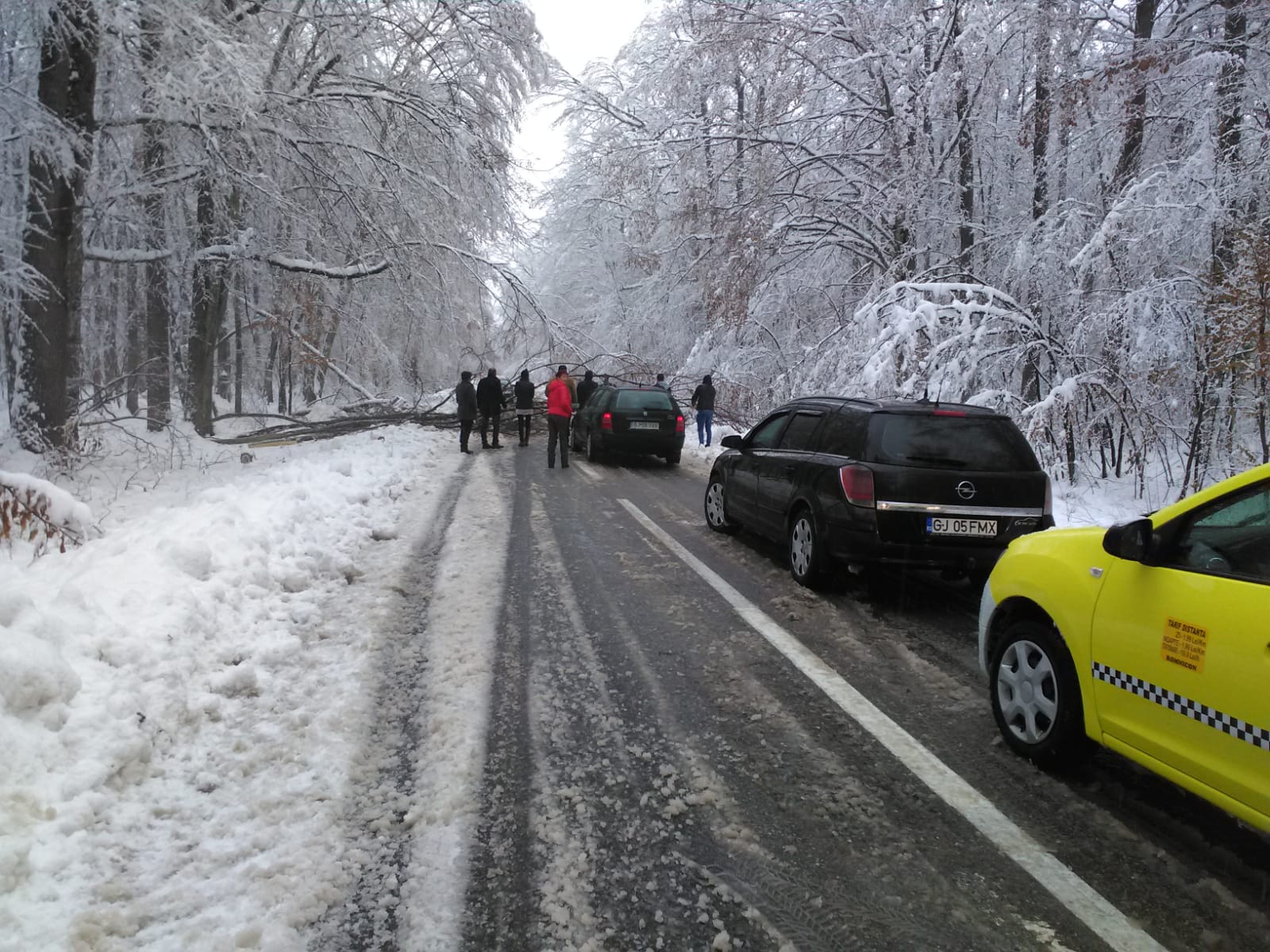 Drumul care traversează pădurea Tismana este blocat din cauza zăpezii. Șoferii critică lipsa de intervenție a autorităților.