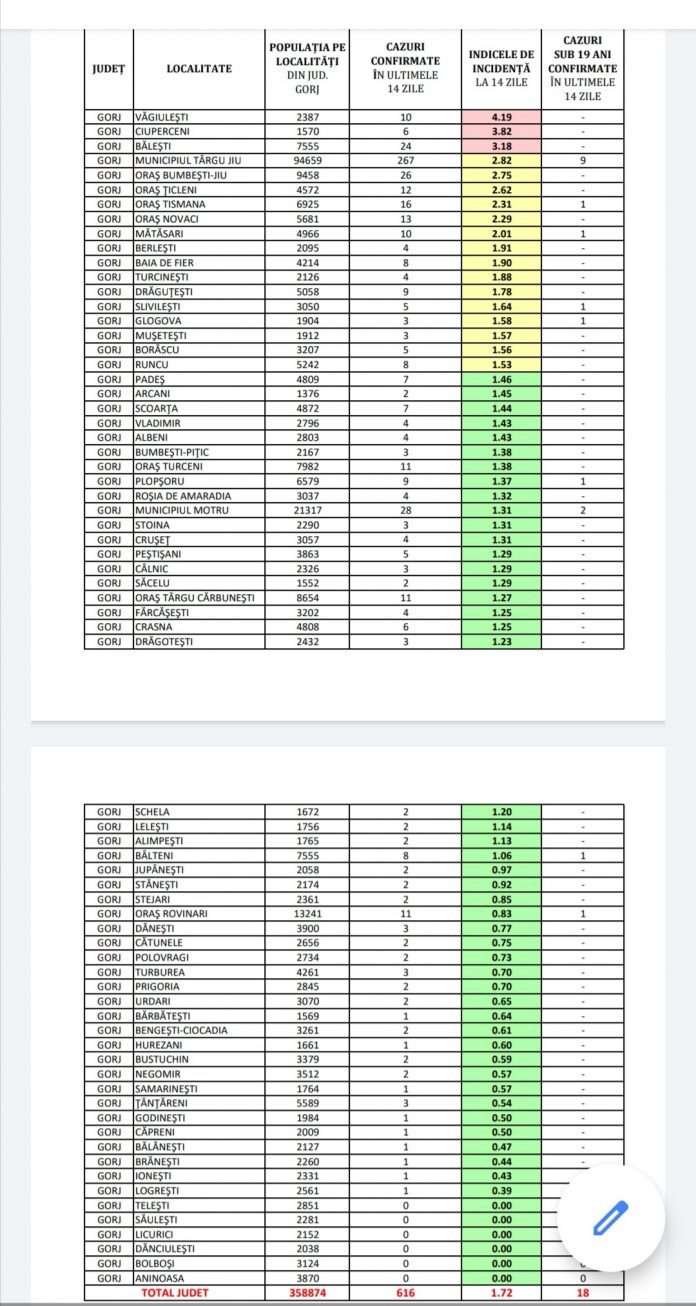 DSP Gorj: Incidența cazurilor de COVID-19, pe localități