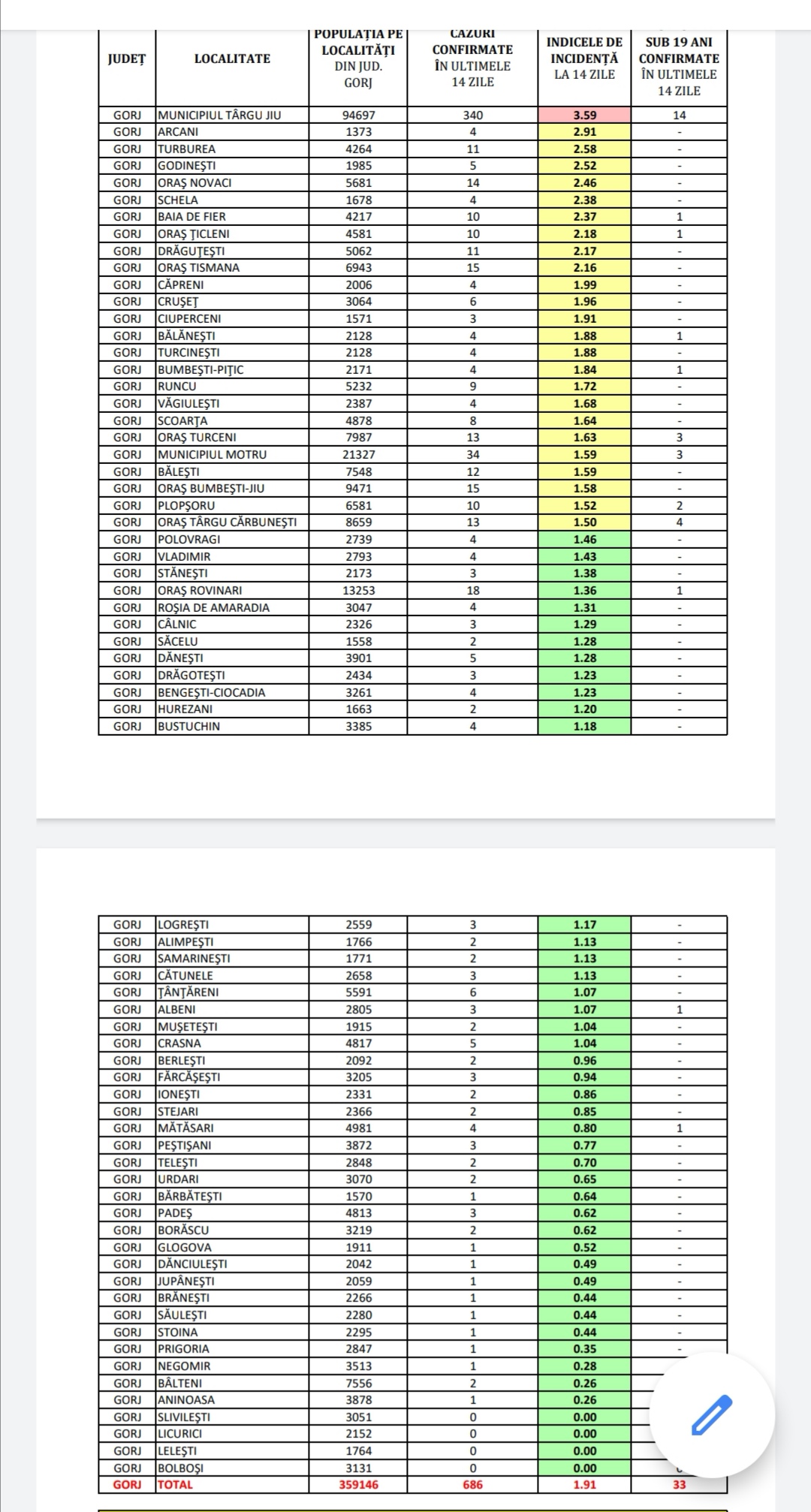 DSP Gorj: Incidența cazurilor de COVID-19, pe localități