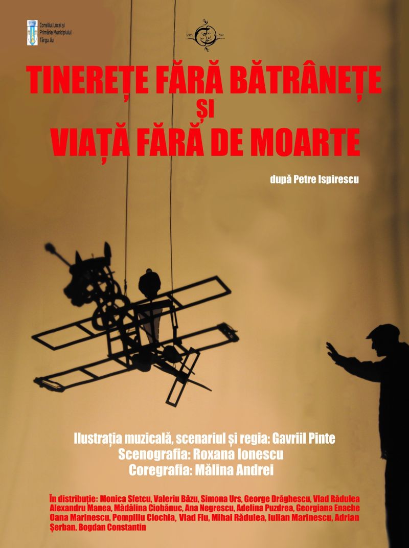 Regia spectacolului este semnată Gavriil Pinte, scenografia îi aparţine Roxanei Ionescu, iar coregrafia Mălinei Andrei. Din distribuţie fac parte: Monica Sfetcu, Bogdan Constantin, Valeriu Bâzu, Simona Urs, George Drăghescu, Vlad Rădulea, Alexandru Manea, Mădălina Ciobănuc, Ana Negrescu, Adelina Puzdrea, Georgiana Enache, Oana Marinescu, Pompiliu Ciochia, Vlad Fiu, Mihai Rădulea, Iulian Marinescu, Adrian Șerban.Biletele se găsesc la Agenția teatrului și online pe www.tomtix.ro. Accesul este permis şi abonaților Aristița Romanescu, cu rezervare.„Tinerețe fără bătrânețe și viață fără de moarte… o poveste despre relativitatea timpului. Străvechile basme – forme ale miturilor… Când spunem basme, ne vine să spunem, aproape automat, basmele copilăriei.Da, dar nu toate basmele sunt ale copilăriei. Problemele din Tinerețe fără bătrâneţe și viață fără de moarte nu prea sunt probleme ale copilului. Iar spectacolul nostru – pe urmele basmului, pe urmele problemelor din interiorul lui. Un spectacol care pune în lumină încercarea omului de a-și depăși limitele fizice (și existențiale), iar apoi se apropie de asumarea condiției umane, trecătoare. C-așa-i lumea, trecătoare… – ne comunică un cântec de demult, cântec de-o actualitate continuă. Încercarea omului dintotdeauna de a-și depăși limitele l-a dus deseori către zbor. Un spectacol al zborului. De dragul și de dorul zborului”, îl defineşte şi îl descrie regizorul Gavriil Pinte.