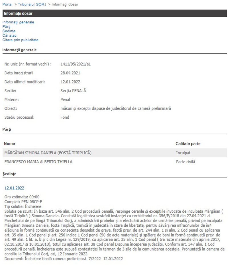 După cinci luni de motivații, amânări și tergiversări: Tribunalul Gorj a dispus începerea judecății în dosarul Francesco Thiela Vs. Simona Mărgăian
