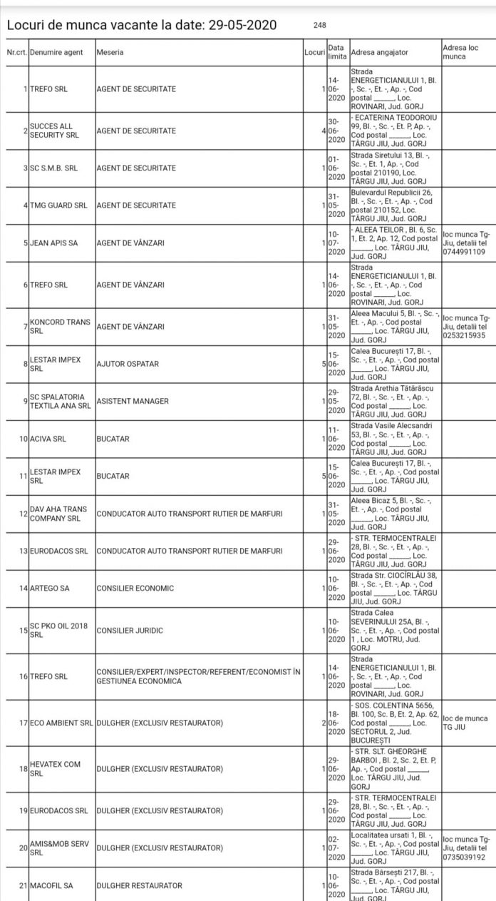 AJOFM Gorj publică un număr de noi 115 locuri de muncă, doar pentru 7 dintre posturi angajatorii cerând studii superioare. Firmele caută agenți de pază, agenți vânzări, bucătari, ajutor ospătar, conducători auto, consilier economic, consilier juridic, dulgheri, electricieni, faianțar, inginer în construcții civile, instalatori, mecanici auto, zidari, zugravi, tâmplari, sudori și patiseri. Lista poate fi consultată la AJOFM Gorj sau pe site-ul instituției.