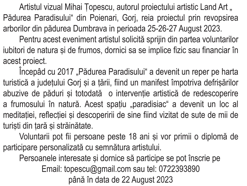 Voluntarii vor primi la final o diplomă cu semnătura lui Mihai Țopescu pentru a putea face dovada că s-au implicat în renașterea acestui important obiectiv turistic. Pădurea Colorată e unul dintre cele mai faimoase proiecte artistice ale lui Mihai Țopescu și, din 2017, a devenit un reper pe harta turistică a Gorjului.