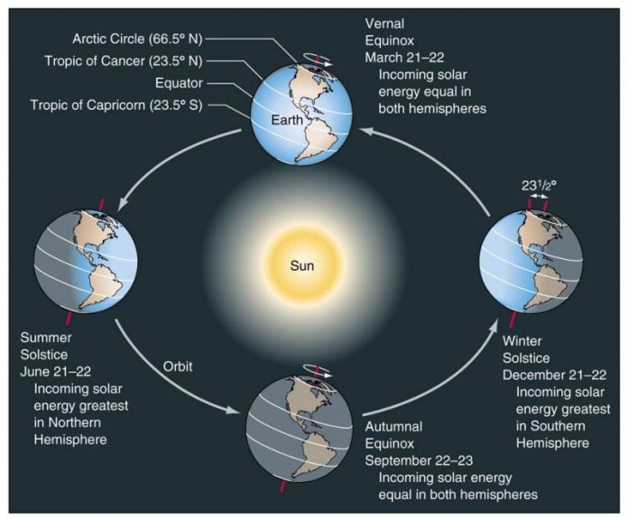 În emisfera sudică a Pământului, data de 23 septembrie marchează începutul primăverii. La latitudinile țării noastre, în aceste zile Soarele va culmina la amiază la o înălțime medie de 45°, ceea ce reprezintă jumătatea distanței unghiulare dintre zenit si orizont.