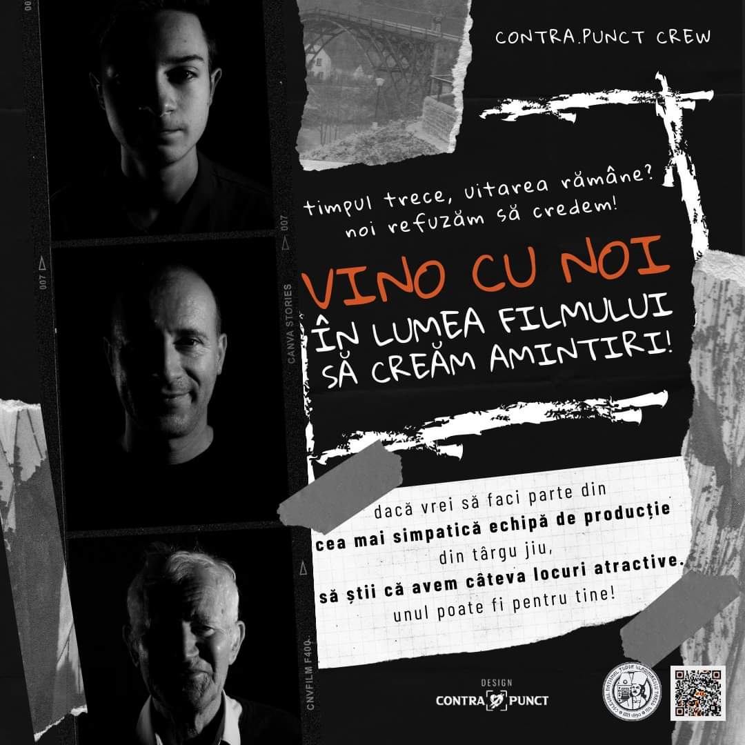 „Suntem în căutarea unor elevi talentați, pasionați de videografie și interesați să se alăture echipei Contra.Punct, sub îndrumarea surprinzătorului regizor și director de fotografie, Luca David Dragodan și a prof. Daniel Murărița. Posturi disponibile: cameraman & edit ; sound recordist & boom operator & sound disigner; scenograf & producător executiv & manager casting; scenarist & secretar de platou & clachetist”, au anunțat, pe rețelele sociale, membrii echipei de la Colegiul Național „Tudor Vladimirescu” Târgu Jiu.
