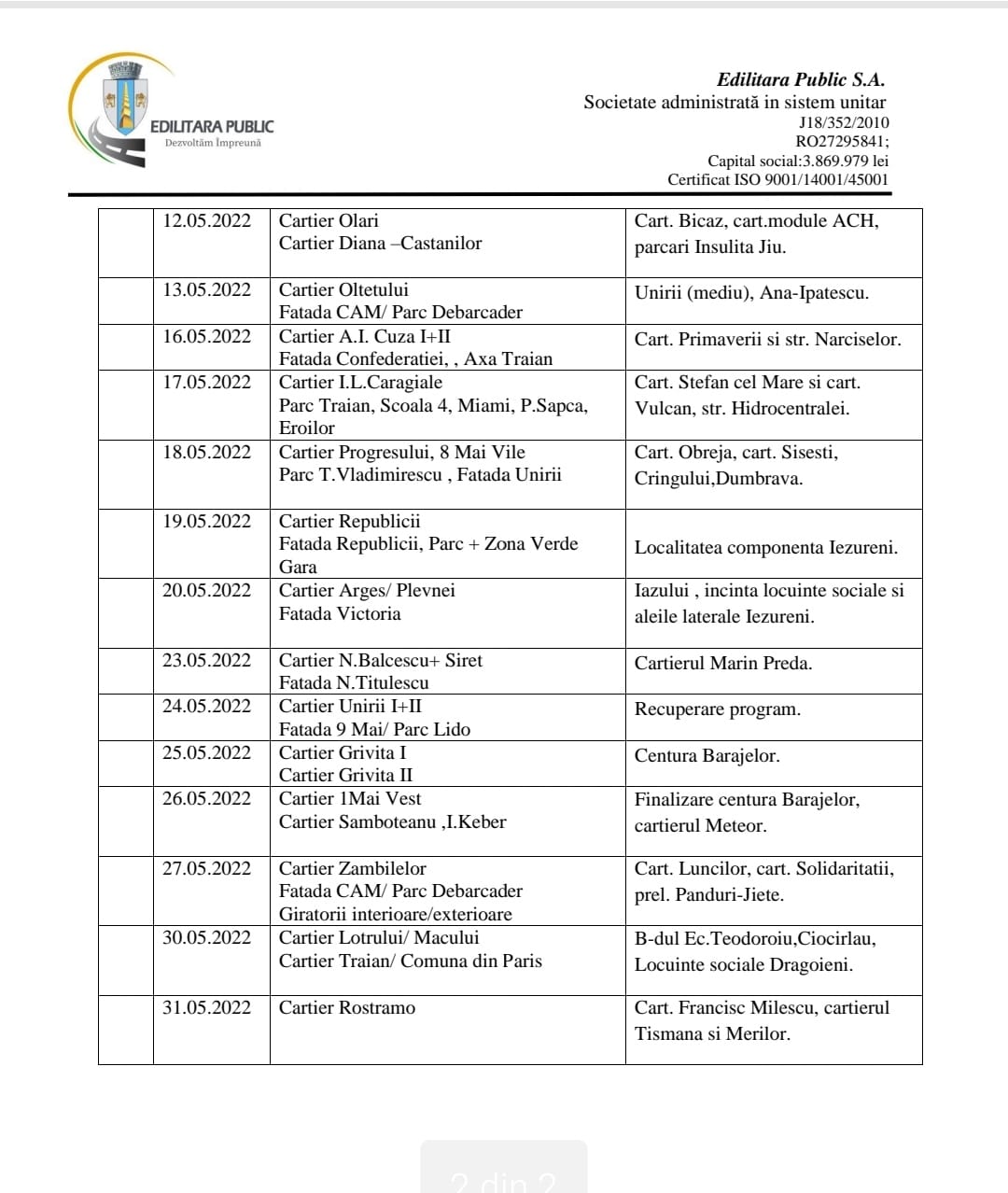 Pentru ca activitatea să se desfășoare într-un ritm bun, cetățenii sunt rugați să nu parcheze mașinile în imediata apropiere a spațiilor verzi, în cazul în care în ziua respectivă se realizează cositul în zonă, pentru a facilita activitatea echipelor de lucru și pentru a evita eventuale daune provocate autovehiculelor”, a anunțat Edilitara Târgu-Jiu.