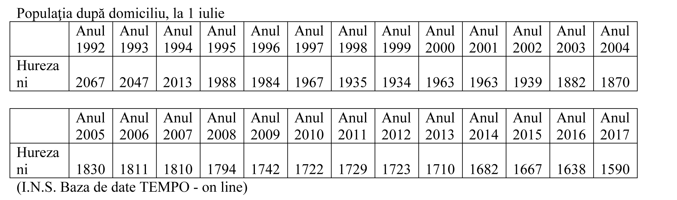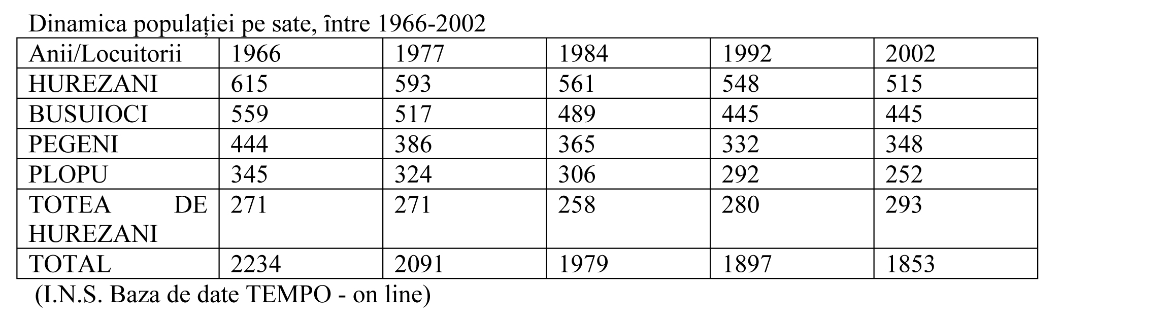 Între anii 1992-2002, datele statistice bazate pe realitatea din teren demonstrează o descreștere a numărului locuitorilor comunei, iar la nivelul satelor sunt oscilații, cu o ușoară creștere care se înregistra la Totea de Hurezani.