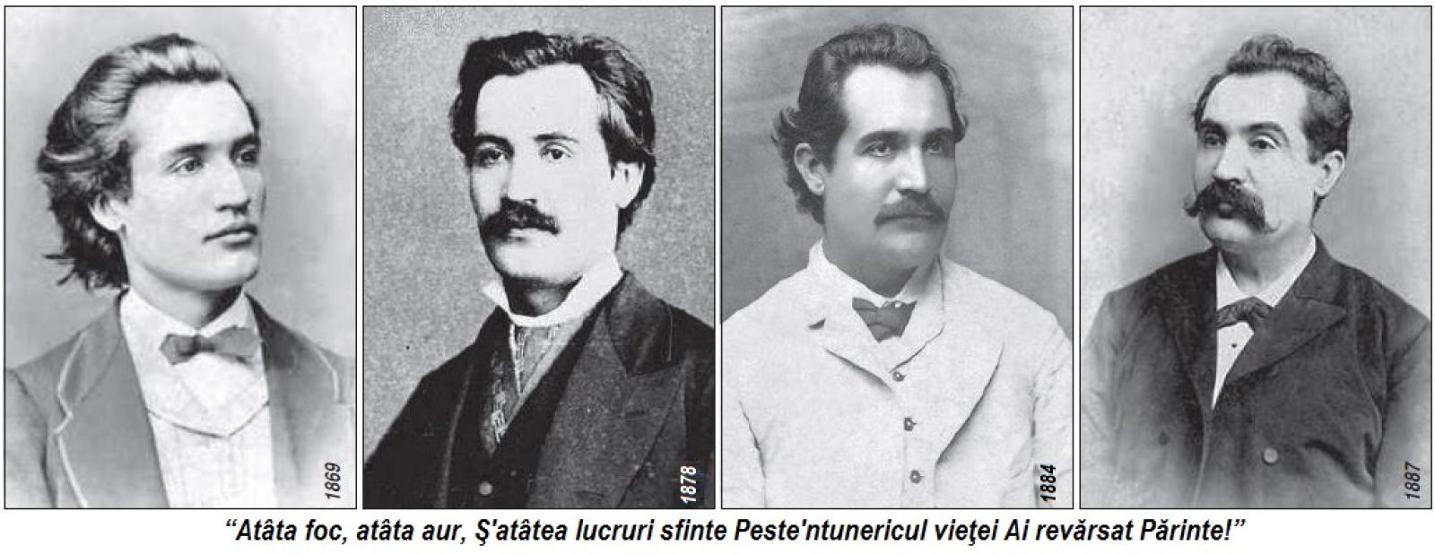 În perioada celor 38 de ani de viaţă, poetul Mihai Eminescu s-a fotografiat, aşadar, doar de 4 ori (1869, 1878, 1884, 1887) şi avem aceste fotografii care s-au transmis până în zilele noastre. Ele sunt reprezentative pentru aspectul fizic al poetului şi au constituit izvor de inspiraţie pentru numeroşi artişti plastici, mai ales că o serie de fotografi au folosit cele patru imagini din fotografiile lui Eminescu pentru realizarea unor variante retuşate, destinate comercializării şi realizării unor gravuri şi cărţi poştale ilustrate. Aşadar, pe cât se poate omeneşte prevedea, literatura poetică română şi gândirea social-politică românească au început secolul al 21-lea creştin sub auspiciile geniului eminescian, «veşnic tânăr şi ferice» ca şi frumuseţea limbii noastre naţionale, care îşi găsesc în poetul şi publicistul, gazetarul şi pamfletarul Mihai Eminescu, cea mai frumoasă înfăptuire a cugetului românesc pentru că întotdeauna el va fi punctul de referinţă pentru toată dezvoltarea viitoare a periplului cugetării româneşti. Iar, ca să încununăm această îndrăzneaţă incursiune în universul spiritului eminescian, prezentăm spre reflecţie câteva maxime şi cugetări eminesciene: ,,Stejarul nu creşte pretutindenea; buruienile, în tot locul”, ,,Eu nu mă supăr deloc de modul cum se reflectă persoana mea în ochii d-tale, căci de la aşa oglindă nici nu mă pot aştepta la alt reflex”!, ,,Oamenii nu se deosebesc atât prin ceea ce zic, cât prin ceea ce fac”, ,,Poate că povestea este partea cea mai frumoasă a vieţii omeneşti… cu poveşti ne leagănă lumea, cu poveşti ne adoarme… Ne trezim şi murim cu ele”, ,,Dă-mă uitării precum te-am mai rugat, căci numai uitarea face viaţa suportabilă”, ,,Popor românesc, mari învăţături îţi dă ţie această întâmplare! Dacă fii tăi ar fi fost uniţi totdeauna, atunci şi pământul tău strămoşesc rămânea unul şi nedespărţit. Dar veacuri de dezbinare neîntreruptă te-au dus la slăbiciune, te-au dus să-ţi vezi ruşinea cu ochii!”, ,,Adevărul e stăpânul nostru, nu noi stăpânim adevărul”, ,,Ştiinţă poate câştiga oricine voieşte, judecată nu!”, ,,Am voi să credem că Occidentul întreg va înţelege, în sfârşit, că la Dunăre, interesele României sunt ale Occidentului însuşi”, ,,Între un diamant şi o grămadă de pietriş cui i-ar fi alegerea grea? Aşa, între aprobarea unui om cuminte şi aplauzele zgomotoase ale mulţimii”, ,,Cu cât o rimă este mai uşoară, cu atât este mai ieftină şi mai comună, şi poetul trebuie să se gândească de două ori pentru a o întrebuinţa. Un poet distins nu va rima niciodată «guriţă-garofiţă»”, ,,Tinereţea şi sărăcia sunt doi duşmani neîmpăcaţi. Manierele, arta de a vorbi şi încânta, toate acestea sunt străine omului care-a trăit între oameni comuni şi care-a fost sărac”, ,,Nenorocirea este cel mai bun dascăl; îşi are metoda ei proprie, dar greş nu dă”, ,,Lumea-i visul sufletului nostru. Nu există nici timp, nici spaţiu – ele sunt numai în sufletul nostru”!