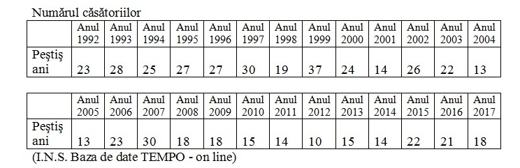 Tabloul nupţialităţii oferă o imagine care reflectă o linie constantă în decursul deceniului 1992-2002, cu un număr de 20-25 de căsătorii anual, iar între 2004-2014 are loc o scădere a formării cuplurilor familiale, însă, în ultimii, până în 2017 se constată o relativă creştere a numărului căsătoriilor, acest lucru putând să se regăsească aproape în acelaşi ritm şi în ceea ce priveşte creşterea numărului nou-născuţilor. Astfel, în ultimii 25 de ani, începând cu deceniul 1992-2002, cu unele variaţii, se poate spune că a scăzut numărul nou-născuţilor de la 41 la 34, iar din 2004, continuând cu 2014 şi încheind cu anul 2017, apare în mod straniu aceeaşi cifră de 23 nou-născuţi, care se apropie în mare măsură de numărul căsătoriilor.