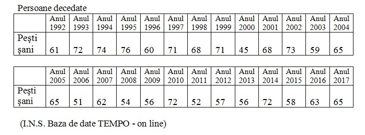 În schimb, dacă se face o analiză comparativă între numărul nou-născuţilor şi numărul persoanelor decedate, situaţia merită o atenţie deosebită, deoarece, dacă în 1992 diferenţa era de numai 20, de la 41 de nou-născuţi la 61 persoane decedate, peste un deceniu, adică, în 2002, această diferenţă s-a dublat, ajungându-se de la 34 nou-născuţi la 73 persoane decedate, iar în 2011 s-a menţinut aceeaşi diferenţă dublă, de la 27 nou-născuţi la 52 persoane decedate, pentru ca în anul 2017 să se consemneze numai 23 de nou-născuţi şi 65 de persoane decedate, deci, înregistrăm o triplare a diferenţei dintre numărul nou-născuţilor şi numărul persoanelor decedate.