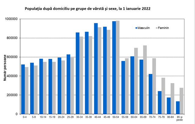 Îmbătrânirea populației din România este un fenomen greu de oprit, iar, datele oficiale ne arată că, dacă avem în vedere numai migrația internațională, într-adevăr, s-a redus foarte mult, am putea spune, în ultimii cinci-șase ani. Dacă, după aderare și în primii ani, 2006, 2007, 2008 am avut valori foarte mari ale migrației, chiar peste jumătate de milion la nivelul unui an, astăzi migrația internațională nu mai este atât de accentuată, dar, factorul natural, cel puțin la nivelul anului 2021, a fost preponderent legat de reducerea populației rezidente. Deci, să reţinem că atât fenomenul de nașteri, cât și fenomenelor de decese sunt două fenomene foarte complexe, pe care nu le putem schimba de pe o zi pe alta. De aceea, poate că rezultatele nu pot fi imediate, dar, dacă dorim să avem modificări în comportamentul populației în următoarea perioadă, va trebui să așteptăm rezultatele poate peste 10-20 de ani, dar în nici un caz de la o zi la alta! Nu putem avea schimbări semnificative în acest sens! De aceea, piramida vârstelor este un instrument foarte important pentru a vedea nu numai structura pe vârste, dar şi care este impactul unor decizii politice, al unor schimbări politice sau al unor momente importante din istoria unei ţări, iar, în această direcţie, să mai constatăm că prin piramida vârstelor de la ultimele două recensăminte, observăm o scădere a bazei, deci practic o scădere a populaţiei rezidente tinere, atât la recensământul din 2011 cât şi la recensământul din 2021, cu precizarea că la recensământul din 2021 baza este şi mai mică şi avem la nivelul populaţiei de sub un an o scădere cu 18%. (VA URMA)