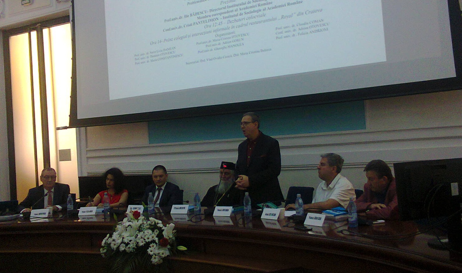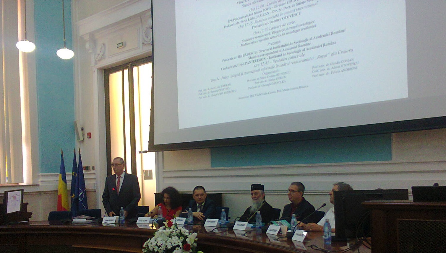 La rândul domniei sale, Prof.univ. dr. Sorin Liviu DAMEAN – Directorul Școlii Doctorale de Științe Sociale și Umaniste a subliniat cu temeinicie următoarele: ,,Avem aici masteranzi, doctoranzi şi viitori doctoranzi care au venit din curiozitate pentru a participa la dezbaterile noastre, pentru că este un eveniment cu totul aparte, iar, domnul profesor Dumitru Otovescu ne-a obişnuit cu astfel de evenimente academice la Universitatea din Craiova! Suntem bucuroşi că putem contribui cu ideile noastre, cu punctele noastre de vedere la evoluţia societăţii umane în general şi la perspectivele ei de dezvoltare! De fapt, sociologia şi istoria sunt înrudite, pentru că am avut de atâtea ori discuţii cu domnul profesor Otovescu pe marginea acestei înrudiri, şi de fiecare dată, am constatat puncte de vedere comune şi mai ales pentru că am constatat perspective de colaborare! Pentru că fără sociologie, cum, de altfel şi fără istorie, nu putem înţelege societatea actuală, nici pe cea din trecut, cu atât mai puţin, să vedem ceea ce se va previoziona de acum înainte! La Universitatea din Craiova avem această Școală Doctorală de Științe Sociale și Umaniste pe trei domenii, pe care le menţionez în ordinea apariţiei lor, fără a se supăra nimeni: istoria, sociologia şi ştiinţa sportului şi educaţiei fizice, o şcoală doctorală cu 16 conducători de doctorat şi acum cu 125 de doctoranzi în diferite stagii de pregătire, pentru că este greu să definitivezi o teză în doar trei ani de zile! Dar, acesta este sistemul educaţional din ziua de astăzi şi trebuie să ne adaptăm, însă, rezultatele pe care le obţin doctoranzii noştri sunt deosebite! O parte dintre rezultatele lor sunt tipărite sub forma unui volum, pentru că aşa este bine! Ştim zicala: «verba volant, scripta manent», spre folosul celor care doresc să-şi îmbunătăţească astfel cunoştinţele. Activităţile noastre în cadrul şcolii sunt de la îndrumări de doctoranzi, până la activităţi didactice specifice, şi poate cea mai grea activitate este legată de cercetare, de elaborarea tezelor de doctorat! Sunt preşedintele comisiei de doctorat la sociologie şi am avut fericitul prilej de a constata progresele în domeniu şi mai ales varietatea tematicilor abordate, actualitatea, oportunitatea problemelor abordate! Sociologia nu se face doar la nivel teoretic, dobândind cunoştinţe şi împărtăşindu-le, dar, se face şi prin componenta practică, fără de care nu ajungem la rezultatele pe care ni le dorim! Sunt bucuros că ne vedem atât de mulţi, chiar dacă este şi perioada de sesiune, dar, faptul că suntem împreună, ne demonstrează încă o dată că activităţile organizate de către Şcoala noastră Doctorală sunt apreciate! Îl văd în sală şi pe domnul profesor Gheorghe Manolea, preşedintele Comitetului Român de Istoria şi Filosofia Ştiinţei şi Tehnicii, filiala Craiova, pentru că domnul Otovescu este membru al acestei comisii, eu sunt doar membru asociat! Simpozionul de astăzi este în comun cu acest comitet, ca să demonstrăm că la Craiova se face carte serioasă, că preocupările noastre sunt pe măsura aspiraţiilor! Felicit pe domnul profesor Dumitru Otovescu pentru iniţiativă, domnia sa a dus tot greul împreună cu comitetul de organizare, pentru ca noi să avem astăzi un eveniment frumos! Este alături de noi şi domnul profesor Adrian Gorun, membru al comisiei doctorale şi unul dintre cei mai prolifici în domeniul sociologiei educaţionale. Să dea Dumnezeu să avem cât mai multe, astfel de întâlniri”, după care acelaşi mentor al manifestării, domnul Prof.univ.dr. Dumitru OTOVESCU a răspuns: ,,Vă mulţumesc, domnule profesor, şi cred că sunteţi în acord cu o subliniere a filosofului danez Kirkegaard, care spune că viaţa nu poate fi înţeleasă decât dacă privim în trecut şi nu poate fi trăită, decât dacă privim în viitor, iar, noi, avem aici, ca să privim în viitor, pe preşedintele Consiliului judeţean Dolj, domnul dr. Cosmin Vasile, un foarte bun cunoscător al universităţii noastre, al comunităţii locale şi care ne va spune ce proiecte vor fi derulate în viitor în judeţul nostru! (VA URMA)