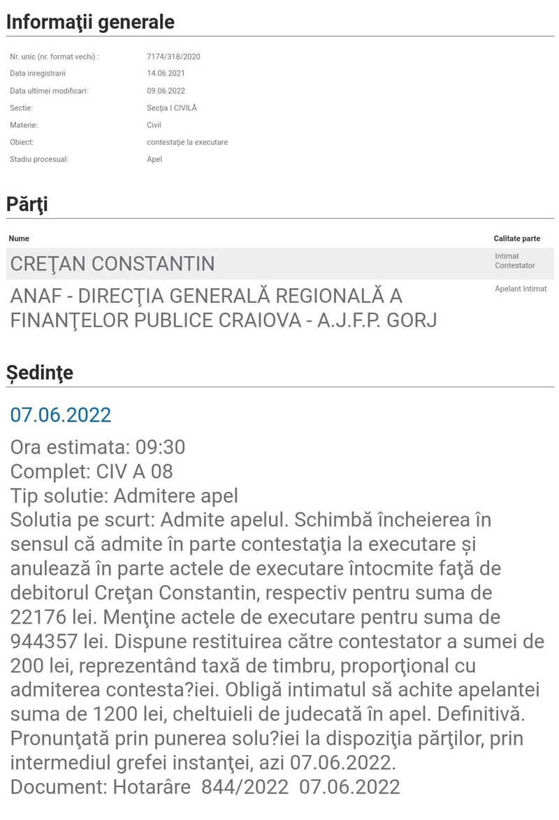 O instanță a Curții de Apel Craiova a stabilit, prin sentință definitivă, să îl absolve pe Constantin Crețan de o sumă de doar 22.000 de lei dar să îl facă să achite restul de peste 944.000 de lei. Procesul s-a derulat cu ANAF-ul, instituție care i-a pus lunar o poprire pe pensie lui Crețan, în valoare de 1400 de lei. De altfel, ex-liderul sindical din Complexul Energetic Oltenia s-a pomenit, acum doi ani, cu aceasta poprire pe pensie și sechestru pe un teren. Totul, la 21 de ani de la mineriada din 1999, pentru care a făcut și 3 ani de închisoare și se considera complet reabilitat.