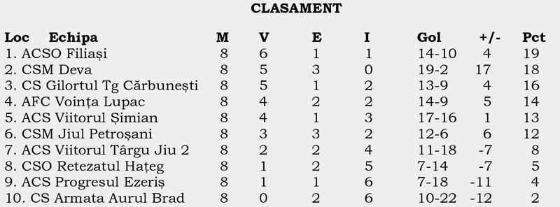 Vizitatorii au condus la pauză prin golul lui Remus Sandu (`32), dar Bogdan Dănăricu a adus egalarea în repriza secundă (`65). A fost prima remiză pentru gorjeni în actuala ediție de campionat. Cealaltă reprezentantă a județului, Viitorul 2, a fost învinsă la Hațeg. Satelitul formației de ligă secundă a fost egala hunedorenilor în primul mitan, dar a încasat două goluri după pauză. Răzvan Vespe a deschis scorul pentru oaspeți, în minutul 15, dar Ovidiu Popesc (`29), Pușcă (`66) și Robert Popa (`75 – penalty) au întors rezultatul. Trupa lui Costel Andriucă este pe locul 7 după acest eșec.