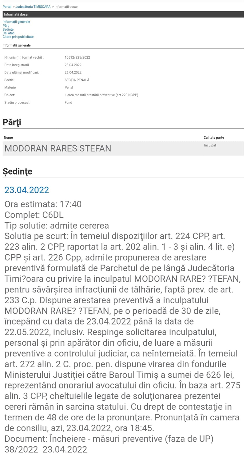 Prezentat instantei de fond, judecătorii decid că târgujianul să mai rămână 30 de zile după gratii astfel: ,,în temeiul dispoziţiilor art. 224 CPP, art. 223 alin. 2 CPP, raportat la art. 202 alin. 1 – 3 şi alin. 4 lit. e) CPP şi art. 226 Cpp, admite propunerea de arestare preventivă formulată de Parchetul de pe lângă Judecătoria Timișoara cu privire la inculpatul MODORAN RAREȘ ȘTEFAN, pentru săvârşirea infracţiunii de tâlhărie, faptă prev. de art. 233 C.p. Dispune arestarea preventivă a inculpatului MODORAN RAREȘ ȘTEFAN, pe o perioadă de 30 de zile, începând cu data de 23.04.2022 până la data de 22.05.2022, inclusiv. Respinge solicitarea inculpatului, personal şi prin apărător din oficiu, de luare a măsurii preventive a controlului judiciar, ca neîntemeiată. În temeiul art. 272 alin. 2 C. proc. pen. dispune virarea din fondurile Ministerului Justiţiei către Baroul Timiş a sumei de 626 lei, reprezentând onorariul avocatului din oficiu. În baza art. 275 alin. 3 CPP, cheltuielile legate de soluţionarea prezentei cereri rămân în sarcina statului”. Sentința nu a fost definitivă iar tânărul a contestat-o.